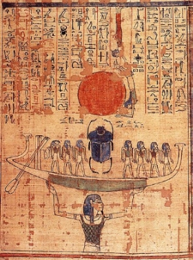 Nun, god of the waters of chaos, lifts the barque of the sun god Ra