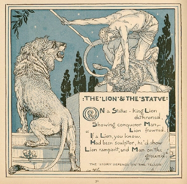 As they were disputing, they passed a statue, carved in stone, which represented "A Lion strangled by a Man."